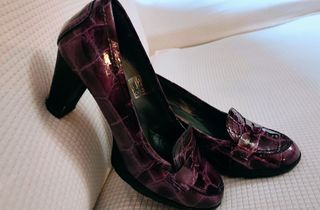 Elegantes zapatos de vestir con tacón cómodo y acabado en charol. - Diseño tipo mocasín. - Textura imitación piel de cocodrilo. - Tacón grueso y estable.