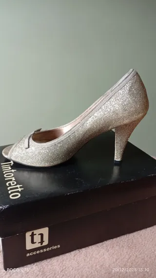 Elegantes zapatos de tacón con un acabado brillante que combina tonos dorados y plateados. Perfectos para añadir un toque de glamour a cualquier ocasión. - Diseño peep-toe con un pequeño lazo decorativo. - Tacón de aguja estilizado. - Ribete plateado en la parte superior.