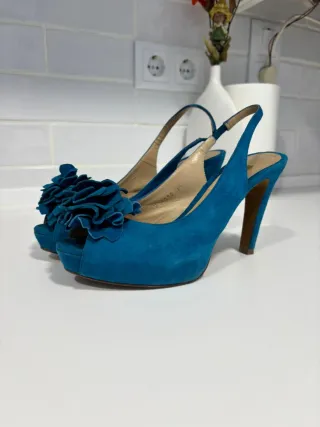 Elegantes zapatos de tacón con un diseño peep-toe y un detalle de flor. - Material: Ante - Color: Azul - Talla: 38 - Estilo: Slingback con plataforma
