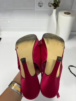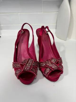 Elegantes zapatos de tacón alto. - Color fucsia vibrante. - Talla 38 europea. - Diseño abierto con adornos. - Tacón fino. - Bolso a juego si se quiere