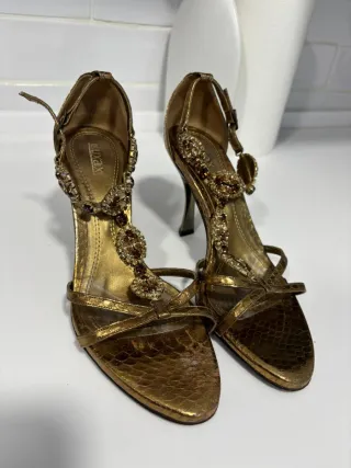 Elegantes zapatos de tacón con un diseño sofisticado. - Acabado metalizado en tono dorado. - Tira fina en el tobillo. - Punta abierta. -Precio original 139€ - puestos sólo en una ocasión - muy cómodos