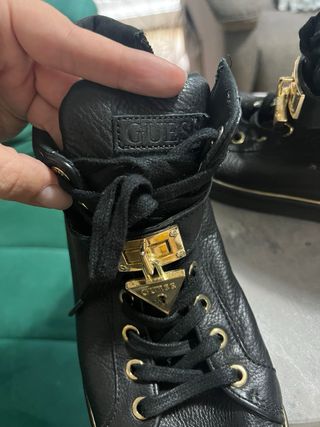 Zapatos de cuero de la marca Guess en color negro. Se encuentran en excelente estado, como nuevos. - Diseño de caña alta. - Cierre con cordones y detalle de hebilla dorada. - Suela con ribete dorado.