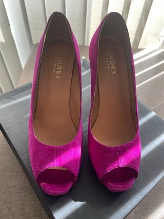 Elegantes zapatos de tacón Zendra con un vibrante color rosa. Perfectos para añadir un toque de estilo a cualquier ocasión. - Diseño peep-toe. - Tacón grueso y estable. - Material de ante. - Usados en una única ocasión.