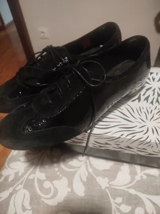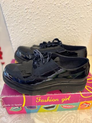 Elegantes zapatos de charol para mujer. - Diseño clásico con flecos. - Cierre de cordones. - Suela gruesa y resistente.