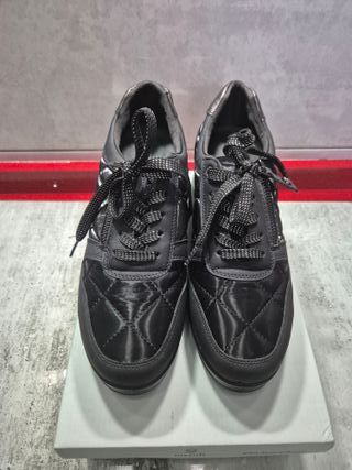 Zapatos deportivos negros con un diseño acolchado. Zapatos de ante acolchados. Talla 40 En perfecto estado Se pueden ver sin compromiso en Paseo Calanda/Avenida Madrid Se hacen envíos mediante wallapop, vinted o correos (no realizo envíos a contrarembolso - Material exterior satinado. - Cierre con cordones. - Detalle metálico en el talón.