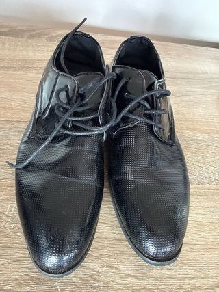 Zapatos de vestir negros para niño, ideales para ocasiones especiales. Son de estilo clásico y están en buen estado, aunque presentan algunas pequeñas marcas de uso. Puestos una sola vez. - Color negro. - Estilo clásico. - Talla (a determinar).