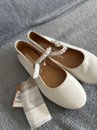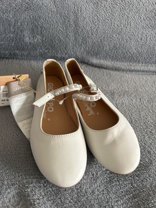 Elegantes zapatos de ceremonia para niña. - Diseño clásico en color blanco. - Adorno de perlas en la tira. - Cierre con hebilla. - Fabricados en piel natural. Varias tallas 31,35,37 Consultar tallas ! Nuevo a estrenar con etiquetas