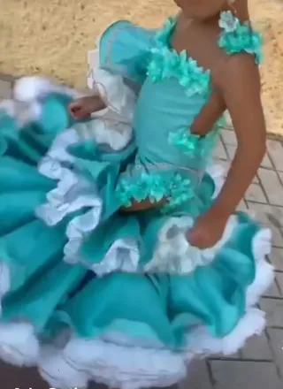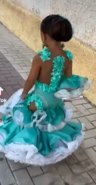 precioso vestido para la feria echo a mano por ada gutierrez tengo las flores y los pemdoemtes a juego y recro de tela por si quieren hacer zapatos usado una vez una niña de 5 años muy alta se puede sacar o meter en almeria capital en las fotos se ve mas azul pero es mas como tiramdo a verde
