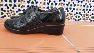 Zapatos de charol, talla 36, marca PITILLOS, interior forrado terciopelo,suela de cuña supercomodos. Usados una vez,a falta de ponerle cordones. Muy por debajo de su precio.