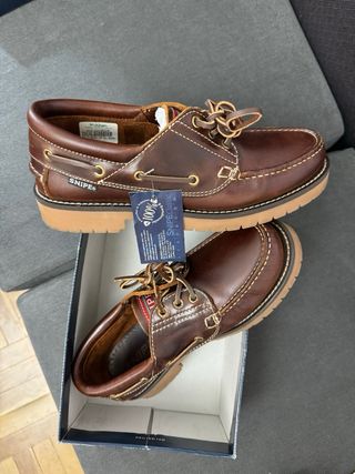Se venden zapatos náuticos de la marca Snipe. Son de color marrón y están hechos de cuero - Ideales para un look casual. - Se encuentran como nuevos. - poco uso no envio recojer en mano contesto en el acto