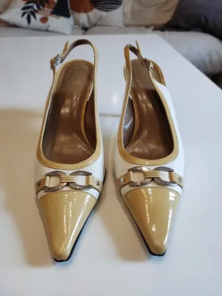 Elegantes zapatos de tacón con un diseño único. - Detalle de costuras en contraste. - Adorno de lazo en la punta. - Acabado interior dorado. Usado en un par de ocasiones. No se hacen envíos.