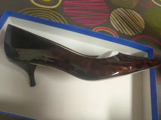 Elegantes zapatos de fantasía con un diseño único. - Combinación de ante negro y puntera efecto carey. - Detalle de lazo decorativo en la parte delantera. - Tacón bajo y punta fina. La suela mide 27 cm de largo Altura del tacon: 6,5 cm