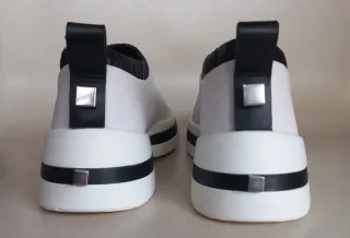 Botines negros de ante con suela blanca. - Diseño tipo calcetín. - Tirador trasero para facilitar el calce. - Detalle de elástico en la parte superior.