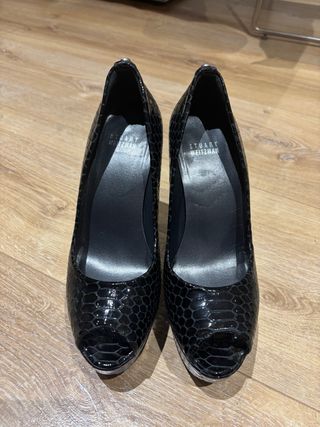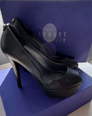 Zapatos originales Stuart Weitzman en talla 39. Piel negra, tacón alto. Solo se han usado en dos ocasiones, están prácticamente nuevos. Muy cuidados, siempre guardados en su caja. Estado excelente, sin marcas de uso