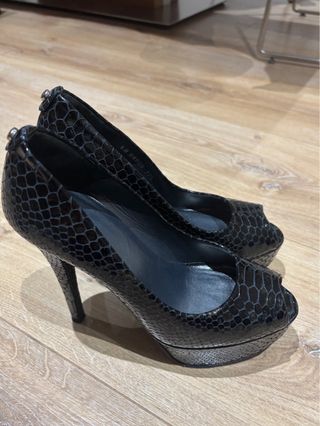 Elegantes zapatos de tacón con un diseño moderno. - Acabado texturizado tipo piel de serpiente. - Punta abierta. - Plataforma delantera. - En buen estado
