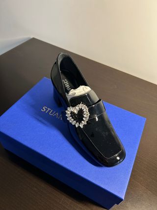 Elegantes zapatos de charol con un detalle de corazón brillante. - Diseño tipo mocasín. - Adorno de pedrería en forma de corazón. - Tacón con altura moderada.