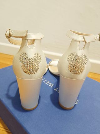 Elegantes zapatos de tacón de Stuart Weitzman con un toque divertido de Disney. Perfectos para un evento especial. - Diseño en satén blanco. - Adorno de pedrería con forma de Mickey Mouse en el talón. - Correa al tobillo con hebilla. - Tacón grueso y cómodo.