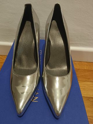 Elegantes tacones de la marca Stuart Weitzman. Diseñados originalmente por el propio Stuart Weitzman. - Color plateado brillante. - Diseño de punta fina. - Tacón curvo. -Piel