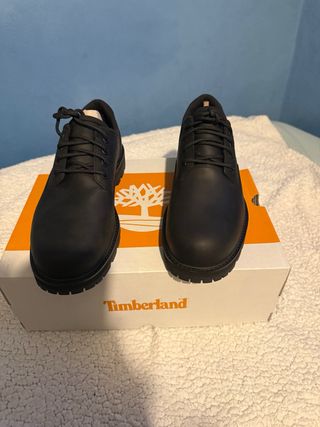 Vendo un par de zapatos Timberland. Son de color negro y tienen un diseño elegante y clásico. - Son de cuero. - Tienen cordones. - Son de estilo Oxford.
