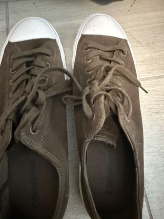 Elegantes zapatos de ante en color beige. - Cierre con cordones. - Suela de goma. - Detalle de costuras. Poco uso, regalo llavero en forma de donut hecho a mano.