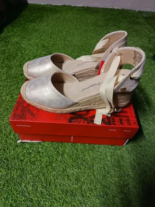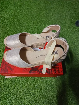 Elegantes zapatos tipo valenciana en color dorado. Talla 39 (23.6cm) Zapato de mujer tipo valenciana, de la marca Xti. Fabricada en suave antelina Cuña de 7 cm forrada en yute con suela de goma antideslizante. Ideal para todos tus looks Este modelo ha obtenido el certificado vegano por la organización mundial PETA (Organización de los derechos de los animales) - Diseño con cuña y atados al tobillo. - Detalle de esparto en la suela. - Acabado metalizado.