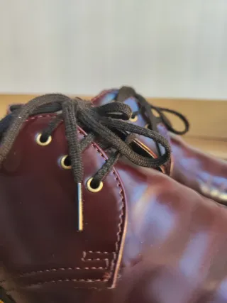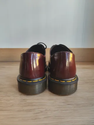 Zapatos Dr. Martens modelo 1461. (3 eye). - Fabricados en piel vegana. - Color burdeos brillante. - Suela con pespunte amarillo característico.