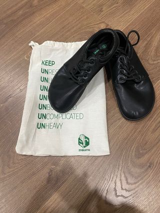 Zapatos bajos estilo barefoot de la marca Saguaro de material vegano. - Color negro. - Talla 38. - Diseño minimalista y flexible. - Incluye bolsa de tela con el lema KEEP UNRESTRICTED, UNBOUNDED, UNCOMPLICATED, UNHEAVY.