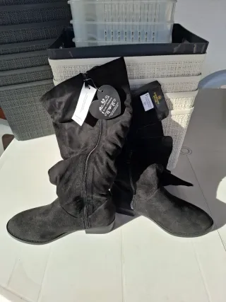 Botas holgadas de la marca americana Room of Fashion. Botas suaves y cómodas. A estrenar, nunca usadas Material sintético • Medidas: altura del tacón: 3.2 cm; circunferencia de apertura: 45.7 cm; talla del zapato: 38-39 (talla americana 8). • Bolsillo oculto dentro de la bota: para tarjetas de crédito, dinero en efectivo, llaves, etc. • Cierre: cremallera lateral interior completa. Suela antideslizante de goma TPR acabada. Diseñado en Estados Unidos. • MATERIAL 100% VEGANO