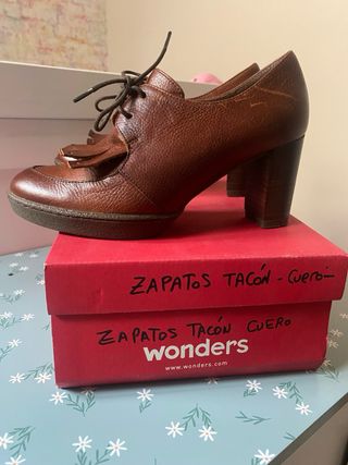 Elegantes zapatos de vestir con un diseño clásico. Marca Wonders. -De piel y hechos en España. - Acabado brillante en tonos marrones y dorados. - Detalle de perforaciones decorativas. - Cordones para un ajuste seguro. -Ligero tacón. -Usados en un par de ocasiones, sin apenas desgaste. ENVÍO SOLO POR EMPRESA CORREOS, no dispongo de otros servicios en mi zona.