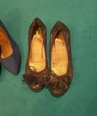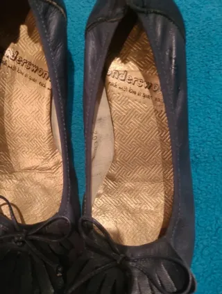 Elegantes bailarinas de la marca Wonders. - Color azul marino con detalles dorados en el interior. - Adorno de flecos y lazo en la puntera. - Talla 37. -Tacones de Primark de regalo