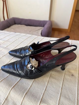 Elegantes zapatos de tacón negros con un diseño sofisticado. - Material: Piel. - Detalle de hebilla. - Punta fina. - Correa trasera tipo slingback.