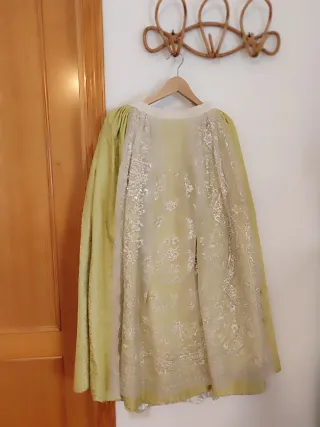 Traje de fallera con un diseño elegante y detalles intrincados. -Mucho más bonito al natural - Tejido principal en tono verde con detalles dorados. - Delicado encaje con bordados plateados y lentejuelas. - Cuello adornado con pasamanería. -solo las manteletas ya costaron más dinero -la tela es adamascada con un dibujo pequeño que en la foto no se aprecia -L s zapatos son un 36-37 -tengo algo de tela