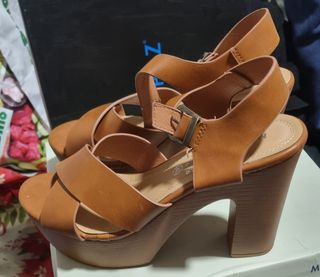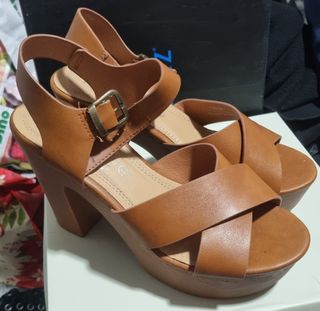 Preciosos zapatos de plataforma, color marrón. Ideales para cualquier ocasión. - Diseño de tiras cruzadas. - Tacón alto y grueso. - Hebilla de cierre en el tobillo. - Material tipo ante.