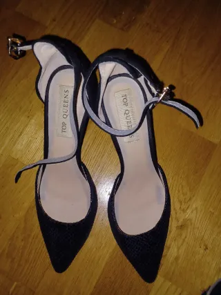Elegantes zapatos de baile negros con detalles brillantes. - Adornados con pedrería plateada. - Diseño de tiras cruzadas en la puntera. - Tira de sujeción al tobillo. - Tacón con detalles metálicos. Muy cómodos , con tacón de 10 cm que se aguanta perfecto porque tiene una cuña se unos dos centímetros delante. Los vendo porque soy muy alta y si me los pongo nadie quiere bailar conmigo 😄