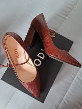 Zapatos de tacón de la marca Lodi, elegantes y de piel, con detalle decorativo en la parte delantera. Medidas: Tacón: 10 cm Cuña / plataforma delantera: 2 cm ➡️Tacón alto pero más cómodo gracias a la cuña. Detalles: Material: piel Detalle frontal con pedrería y apliques Importante: la pedrería no está completa (un zapato sólo conserva una pieza) Desgaste visible en el tacón Desgaste en la parte interior de la suela, tal y como se aprecia en las fotos Por este motivo, el precio es ajustado. Se vende tal cual se muestra en las imágenes.