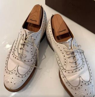 Elegantes zapatos de vestir con un diseño clásico y detalles de picado. - Color beige y blanco. - Acabado en cuero texturizado. - Suela de madera.