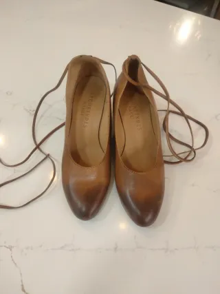 Elegantes zapatos de piel en color marrón. Con tiras para atar a tobillos. Puestos 1 día. Totalmente de cuero.30 - Material: Cuero genuino. - Diseño de tacón con tiras para atar.