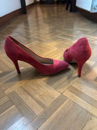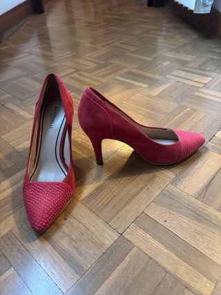 Elegantes zapatos de tacón de ante en color rojo. Usados una ocasión. - Detalle de escamas en la punta. - Tacón fino. - Marca: Martinelli.