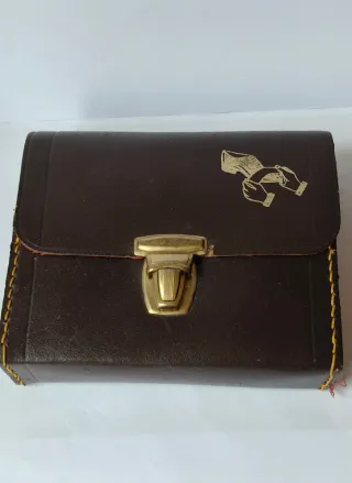 Estuche para el cuidado de zapatos. - Diseño compacto y práctico. - Cierre metálico dorado. - Detalle de costura exterior. - Grabado de manos limpiando zapatos.