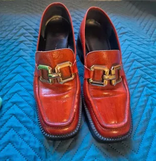 Elegantes mocasines de color rojo con un detalle de hebilla dorada. - Diseño clásico. - Acabado brillante. - Suela gruesa.