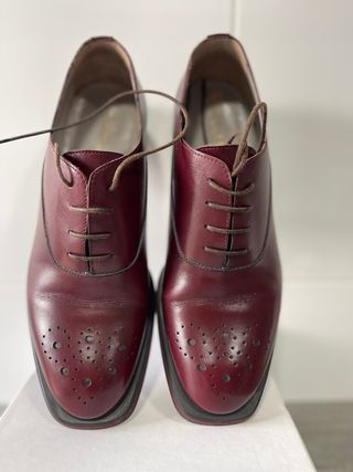 Elegantes zapatos de cordones con un acabado en cuero burdeos. - Diseño tipo Oxford. - Detalle de picado en la puntera. - Cordones a tono.