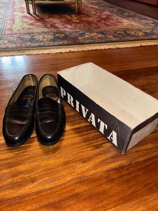 Elegantes zapatos de vestir negros de la marca Privata. - Diseño clásico tipo mocasín. - Acabado brillante. - Detalle de antifaz en la pala. - Interior con logo de la marca.