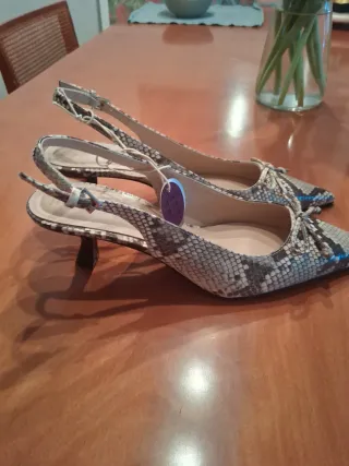 Preciosos zapatos de tacón de la marca Zara. Son de color beige y negro, con estampado de serpiente en el talón. Ideales para cualquier ocasión. - Talla 36 - Material ante y piel de serpiente sintética - Tacón fino y elegante - Perfecto estado