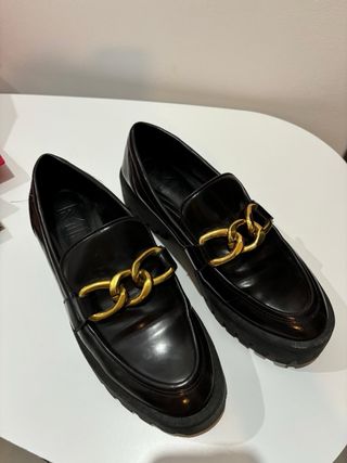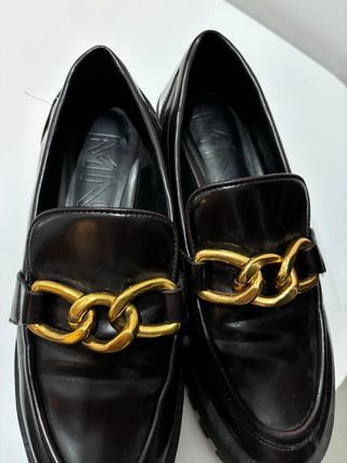 Mocasines de la marca Mango con un diseño elegante y moderno. - Detalle de cadena dorada en la parte delantera. - Acabado brillante. - Suela gruesa.