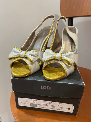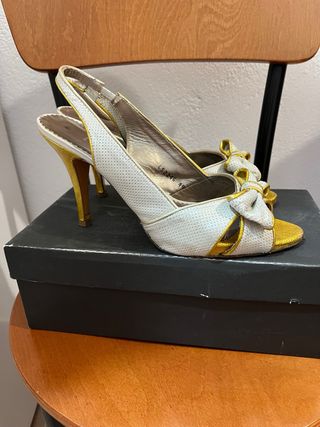 Zapatos de tacón dorados y blancos
