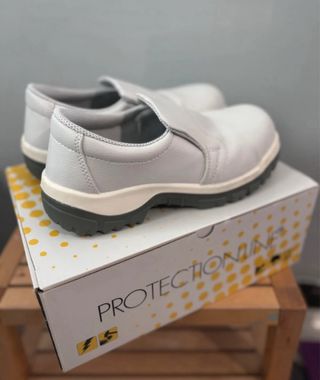 Zapatos utilizados un día. En perfecto estado. De Microfibra, evita la penetración y la absorción de agua Puntera de acero. Collarín acolchado. Suela de PU de doble densidad Máximo coeficiente antideslizamiento. ACTION LEATHER HIDRÓFUGO. Indicados para ámbito sanitario como farmacia, hospitales, clínicas cocina, limpieza etc