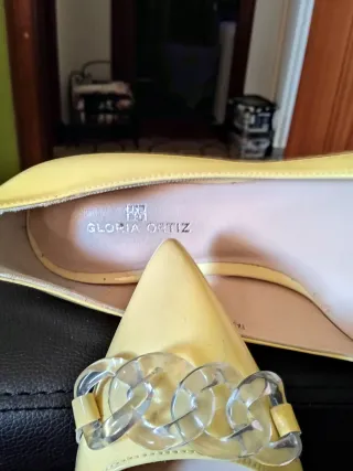 Elegantes zapatos planos de la marca Gloria Ortiz en color amarillo. - Diseño de punta fina. - Adorno de eslabones transparentes en la pala. - Interior con logo de la marca.