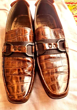 Elegantes zapatos de vestir para hombre con un diseño único. - Acabado en piel con textura de cocodrilo. - Detalle de tira con hebillas metálicas. - Suela de goma.