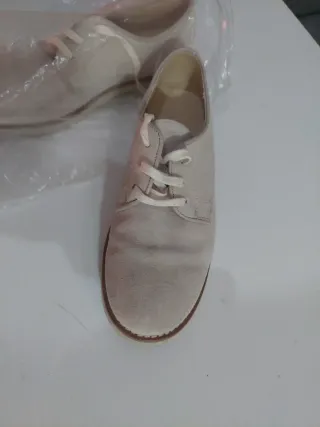 Zapatos de comunión para niño, color beige. Solo una puesta, me costaron 60€. Miden 25cm de largo son el número 36. - Diseño clásico con detalles troquelados. - Cierre con cordones. - Interior con logo de la marca. La marca es Yowas una marca muy buena de zapatos infantiles.