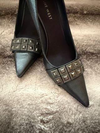 Elegantes zapatos de tacón Nine West. - Color gris plateado. - Adorno de tachuelas en la tira. - Punta fina.